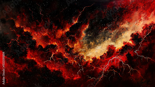 Cosmic storm, swirling clouds of red and black with flashes of lightning, intense light and shadow contrasts, dynamic energy