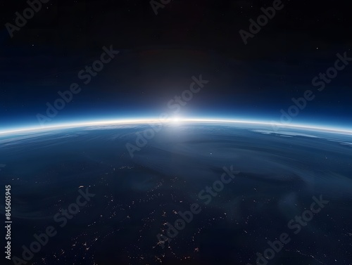 Cosmic Sunrise: Panoramic View of Earth, Sun, Stars, and Galaxy.. Panoramic view of the Earth, sun, star and galaxy. Sunrise over planet Earth, view from space