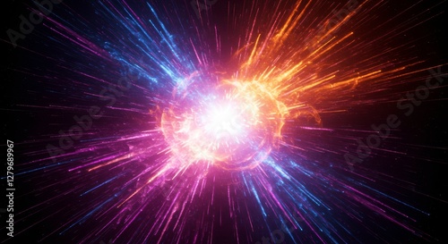 Cosmic Symphony: A breathtaking display of energy erupts from a central core, with vibrant colors streaking outward in a mesmerizing cosmic dance. The scene is a visual feast.