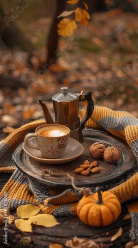 Cosy autumn picnic setup in the woods, with a grey blanket, pumpkins, coffee mokka pot and pumpkin latte.