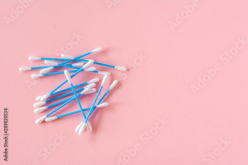 Cotton ear sticks for personal hygiene on pink background. Healthcare tools. Empty space for text.