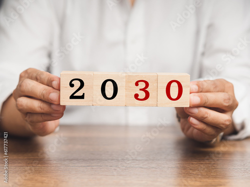 Countdown and Business Planning to 2030. Close-up of hand holding wooden cubes with the letters 2030 while sitting at the table.
