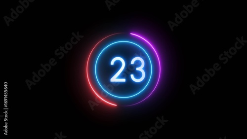 Countdown timer 23 seconds. Neon countdown number illustration.
