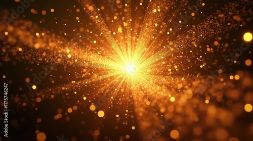 Countless golden particles glowing and radiating outward from an intense central light source, forming dynamic light streams on a contrasting dark backdrop.