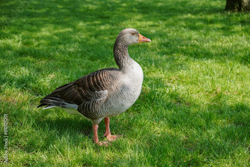 country goose standing on grass getting some shade from the summer sun. profile of a greylag goose