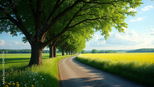 Country Road Through Canola Fields: A winding road leading through a vibrant landscape, where rows of golden canola fields meet a line of lush, green trees, with a blue sky and fluffy white clouds.