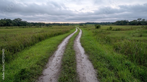 Country Road Through Lush Grassy Field Under Cloudy Sky. Possible Use Stock photo
