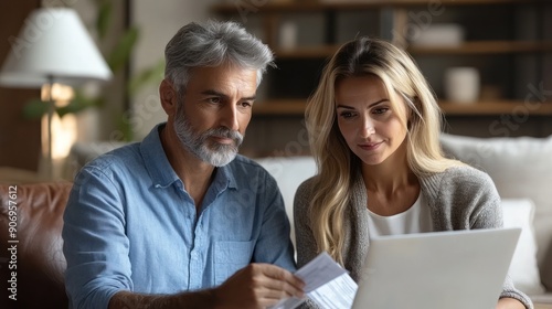 Couple collaborates on paperwork while working on a laptop in their cozy living room