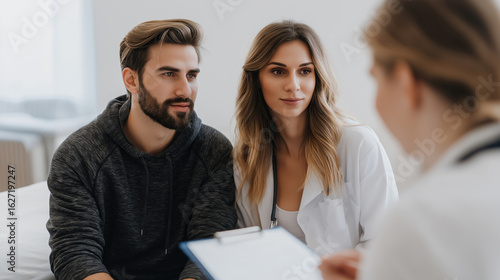 Couple discussing health concerns with medical professional in a modern clinic setting