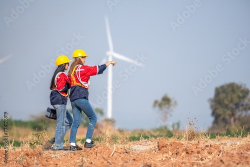 couple engineer team inspection check control wind power machine construction installation in wind energy factory. Two technician professional worker discussion for maintenance wind power turbine