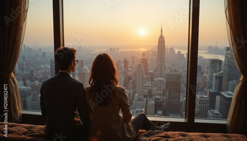 Couple enjoying a sunset view over a city skyline from a high-rise window with a chilly evening atmosphere