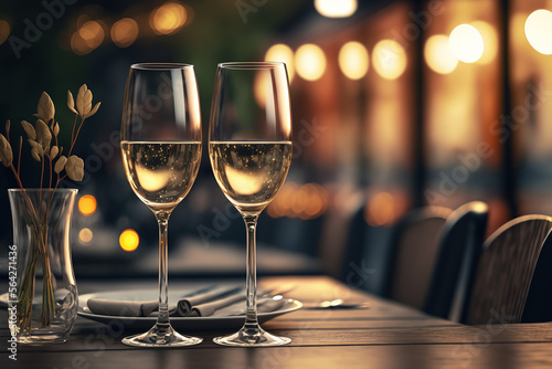 Couple glassess of the champagne or white wine are placed on wooden table in restaurant background. Generative Ai image.