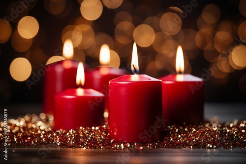 Couple of burning red candles with Christmas decorations and blurred glitter background