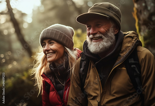couple on trail in forest, exploring, smiling, fun. Generative AI
