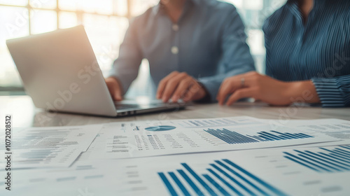 Couple reviewing property loan options with laptop and financial reports, analyzing data and discussing strategies for investment decisions