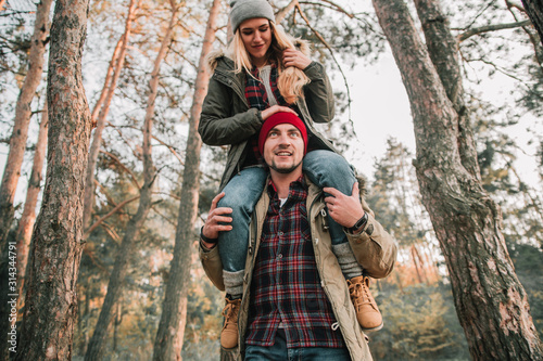 Couple travelers is so fun in the forest. Concept of trekking, adventure and seasonal vacation.