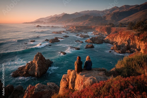 Couples unwind on cliffs, enchanted by the sunset and crashing waves, creating a romantic vibe