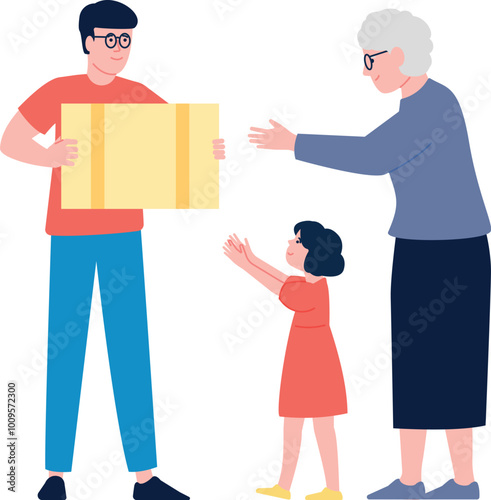 Courier deliver cardboard box to old lady. Shipping service