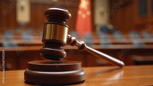 Courtroom gavel in front of Chinese flag in judicial setting