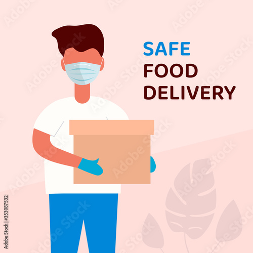 COVID-19. Quarantine. Coronavirus epidemic. A courier in a protective medical mask and gloves holds parcel. delivering grocery order to the home of customer. Free food delivery. Stay home.
