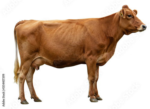 Cow standing gracefully with a curious expression on white background, showcasing its healthy coat and prominent features typical of dairy cattle.
