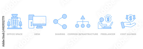 Coworking banner web icon vector illustration concept with icon of office, workspace, desk, sharing, common infrastructure, freelancer, and cost saving