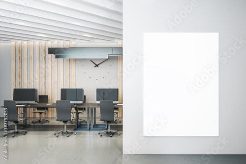 Coworking office interior withclock on the wall and computers.