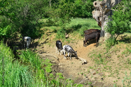 Cows drinking and grazing by the River Mole in Horley, Surrey.