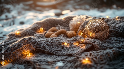 Cozy and Warm Winter Scene with Knitted Blanket, Decorative Ball, and Twinkling Lights on a Snowy Ground Capturing the Essence of Holiday Comfort and Nostalgia