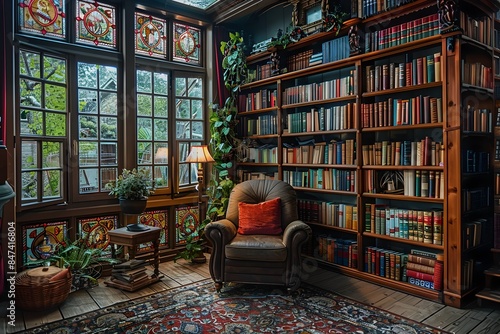 Cozy Antique Bookshop Interior with Aged Leather-Bound Volumes on Wooden Shelves
