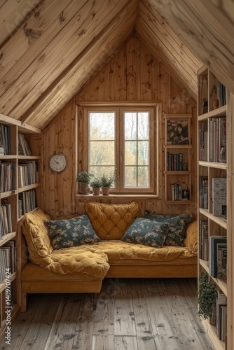 Cozy attic room with a couch window and bookshelves wood paneling.