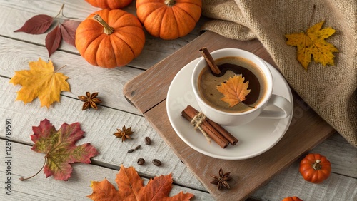 Cozy autumn coffee setup featuring cinnamon sticks, colorful leaves, and pumpkins in a warm atmosphere