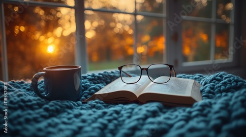 Cozy Autumn Evening Reading by the Window with Warm Drink and Open Book