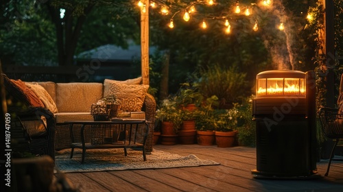 Cozy backyard patio with warm lighting and heat, creating a welcoming atmosphere