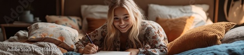 Cozy Boho Bedroom Scene with Young Woman Journaling in Pajamas