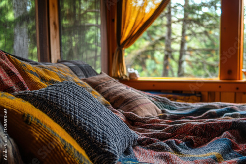 Cozy cabin interior with colorful blankets and scenic forest view through large windows