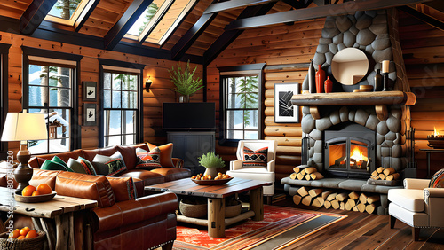 Cozy cabin: Wood paneling, fireplace, and rustic furnishings, offering warmth and tranquility in a rustic retreat,Generative AI