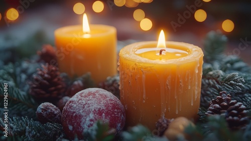Cozy Christmas Candles Glow Warmly Amidst A Snowy Evergreen Wreath, Pine Cones, And Frosted Berries. A Festive Winter Scene.