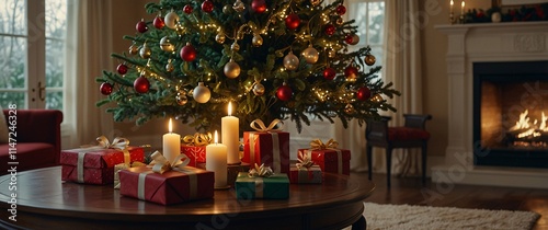 Cozy Christmas Eve: A warm and inviting scene of Christmas presents under a beautifully decorated tree, with burning candles and a fireplace adding to the festive ambiance.