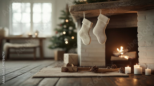 Cozy Christmas scene featuring decorated fireplace with hanging stockings, candles, and Christmas tree in background, creating warm and festive atmosphere