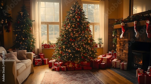 Cozy Christmas Tree with Gifts and Decor in Warm Living Room