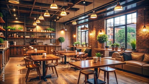 Cozy coffee shop interior with warm lighting and wooden furniture, warm, rustic, ambiance