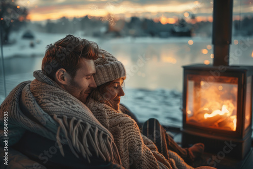 Cozy Couple Relaxing by Fireplace in Rustic Cabin During Winter
