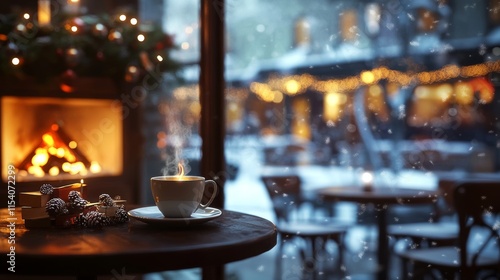 Cozy Cup of Coffee Beside a Fireplace With Winter Snow Falling Outside in a Warm Cafe Setting
