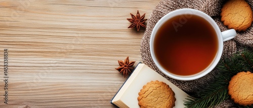 Cozy cup of tea with cookies and spices on a wooden table for a comforting moment.