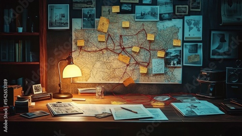 Cozy dimly lit detective or investigation desk with map covered in red string and yellow notes surrounded by photos and documents under a warm desk lamp