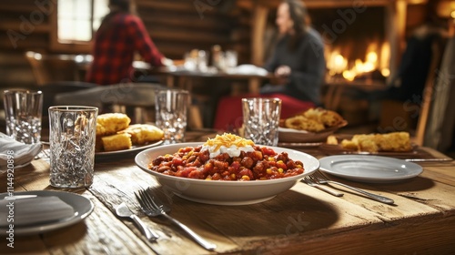 Cozy Dinner Setting with Chili and Cornbread by a Warm Fireplace