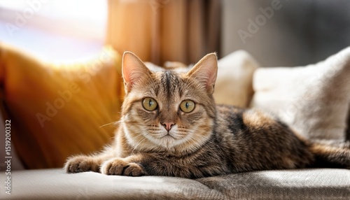 Cozy Evening Bliss A Graceful ShortHaired Cat Relaxing on a Sofa at Home, Surrounded by Warmth and Serenity, Capturing the Perfect Moment of Feline Contentment.