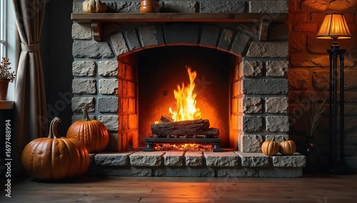 Cozy fireplace crackling merrily, casting a warm orange glow on a rustic stone wall Perfect for autumn, winter, or hygge-themed projects , heat, interior design