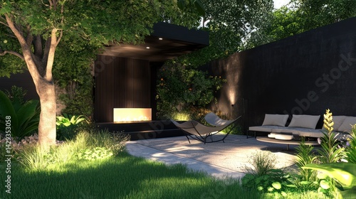 Cozy fireplace in modern patio for relaxation, entertainment, and family gathering